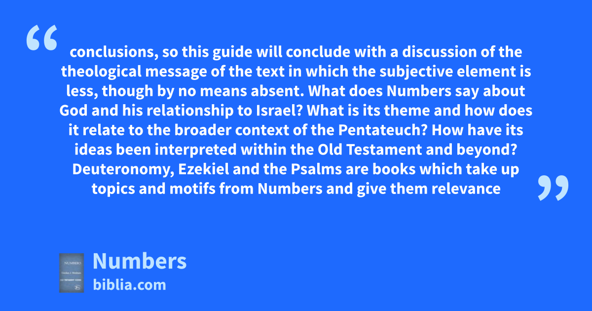 conclusions, so this guide will conclude with a discussion of the theological message of the text in which the subjective element is less, though by no means absent. What does Numbers say about God and his relationship to Israel? What is its theme and how does it relate to the broader context of the Pentateuch? How have its ideas been interpreted within the Old Testament and beyond? Deuteronomy, Ezekiel and the Psalms are books which take up topics and motifs from Numbers and give them relevance