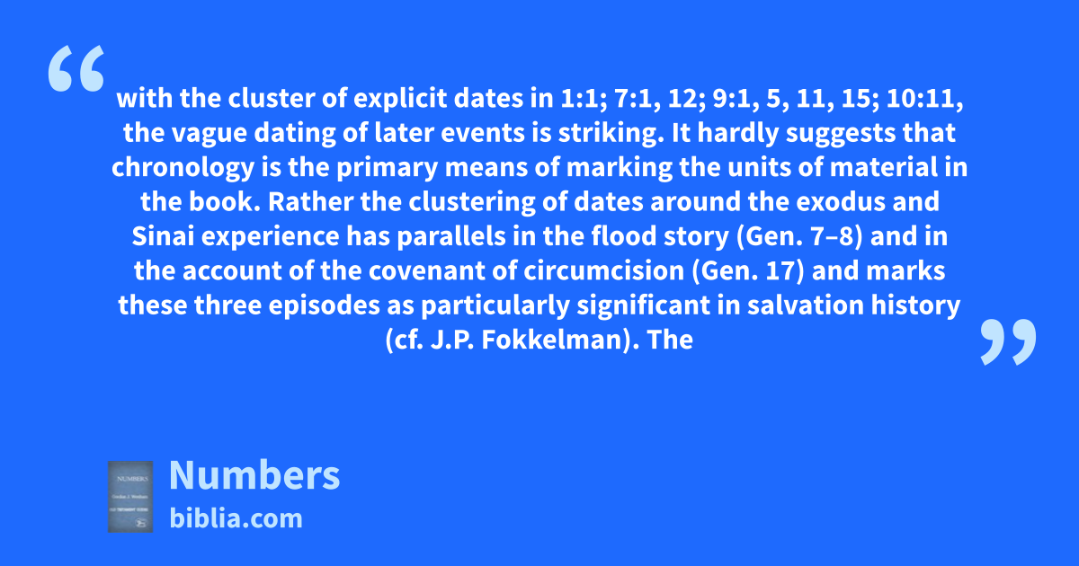 with the cluster of explicit dates in 1:1; 7:1, 12; 9:1, 5, 11, 15; 10:11, the vague dating of later events is striking. It hardly suggests that chronology is the primary means of marking the units of material in the book. Rather the clustering of dates around the exodus and Sinai experience has parallels in the flood story (Gen. 7–8) and in the account of the covenant of circumcision (Gen. 17) and marks these three episodes as particularly significant in salvation history (cf. J.P. Fokkelman). The