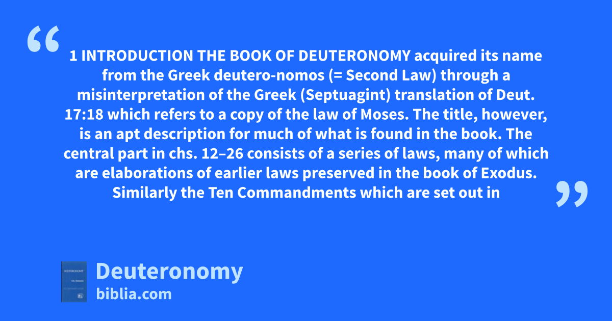 1 INTRODUCTION THE BOOK OF DEUTERONOMY acquired its name from the Greek deutero-nomos (= Second Law) through a misinterpretation of the Greek (Septuagint) translation of Deut. 17:18 which refers to a copy of the law of Moses. The title, however, is an apt description for much of what is found in the book. The central part in chs. 12–26 consists of a series of laws, many of which are elaborations of earlier laws preserved in the book of Exodus. Similarly the Ten Commandments which are set out in