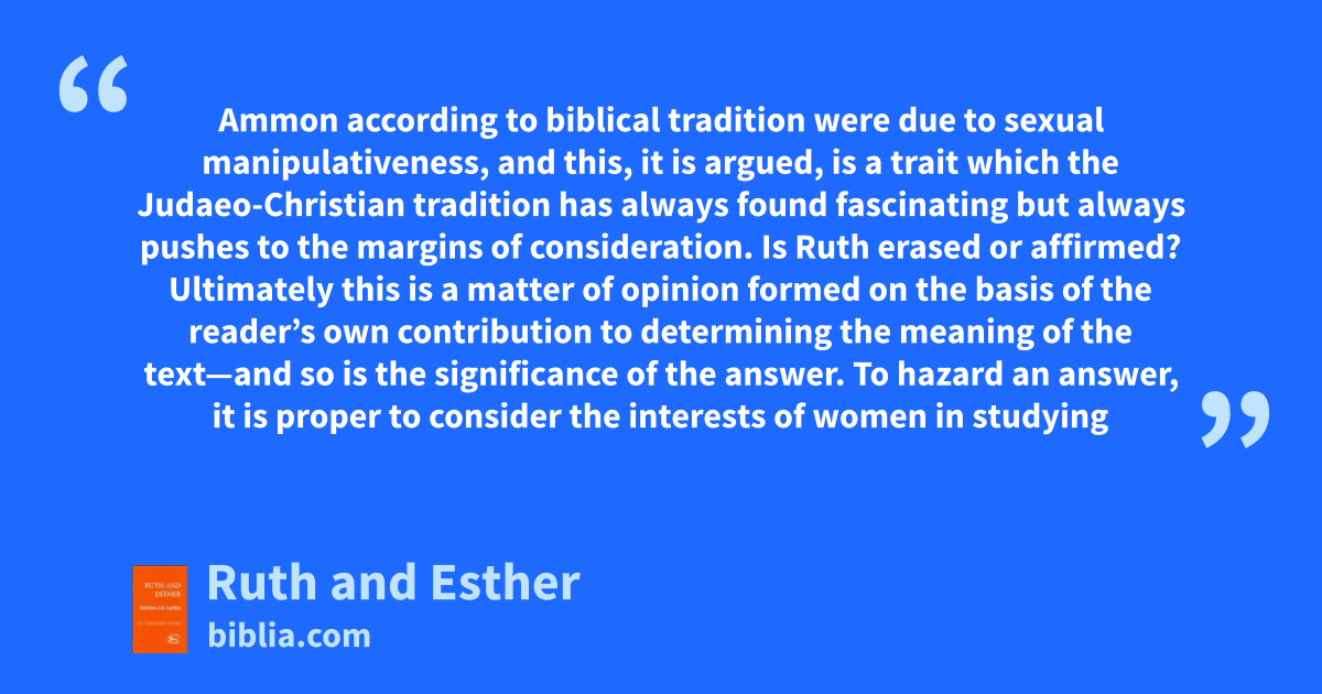 Ammon according to biblical tradition were due to sexual manipulativeness, and this, it is argued, is a trait which the Judaeo-Christian tradition has always found fascinating but always pushes to the margins of consideration. Is Ruth erased or affirmed? Ultimately this is a matter of opinion formed on the basis of the reader’s own contribution to determining the meaning of the text—and so is the significance of the answer. To hazard an answer, it is proper to consider the interests of women in studying