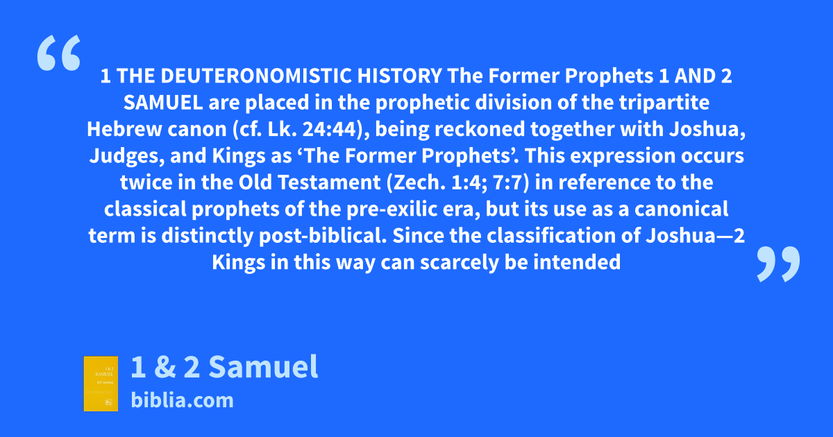 1 THE DEUTERONOMISTIC HISTORY The Former Prophets 1 AND 2 SAMUEL are placed in the prophetic division of the tripartite Hebrew canon (cf. Lk. 24:44), being reckoned together with Joshua, Judges, and Kings as ‘The Former Prophets’. This expression occurs twice in the Old Testament (Zech. 1:4; 7:7) in reference to the classical prophets of the pre-exilic era, but its use as a canonical term is distinctly post-biblical. Since the classification of Joshua—2 Kings in this way can scarcely be intended