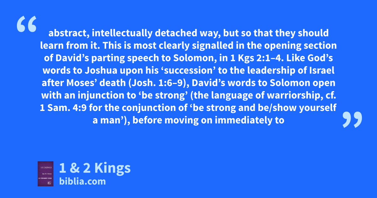 abstract, intellectually detached way, but so that they should learn from it. This is most clearly signalled in the opening section of David’s parting speech to Solomon, in 1 Kgs 2:1–4. Like God’s words to Joshua upon his ‘succession’ to the leadership of Israel after Moses’ death (Josh. 1:6–9), David’s words to Solomon open with an injunction to ‘be strong’ (the language of warriorship, cf. 1 Sam. 4:9 for the conjunction of ‘be strong and be/show yourself a man’), before moving on immediately to