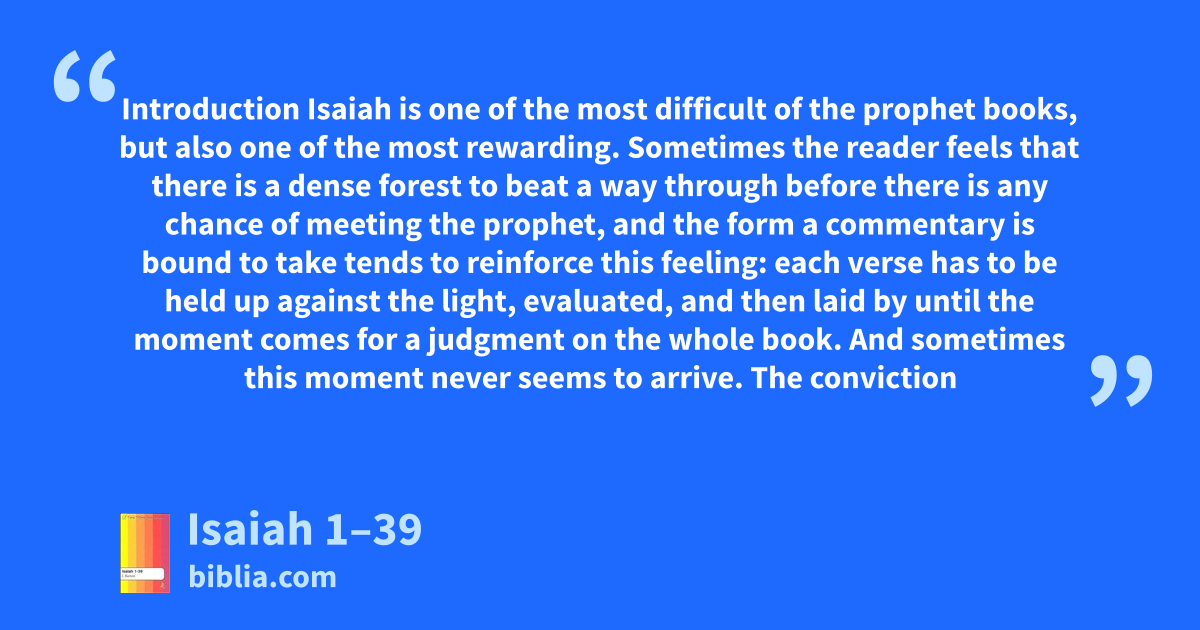 Introduction Isaiah is one of the most difficult of the prophet books, but also one of the most rewarding. Sometimes the reader feels that there is a dense forest to beat a way through before there is any chance of meeting the prophet, and the form a commentary is bound to take tends to reinforce this feeling: each verse has to be held up against the light, evaluated, and then laid by until the moment comes for a judgment on the whole book. And sometimes this moment never seems to arrive. The conviction
