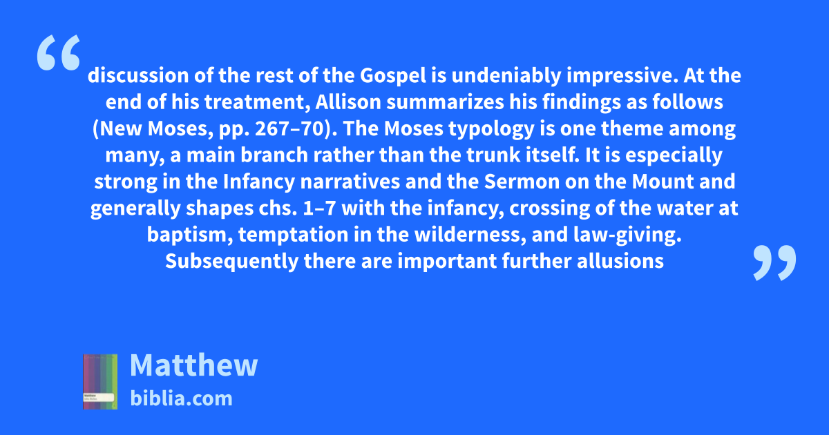 discussion of the rest of the Gospel is undeniably impressive. At the end of his treatment, Allison summarizes his findings as follows (New Moses, pp. 267–70). The Moses typology is one theme among many, a main branch rather than the trunk itself. It is especially strong in the Infancy narratives and the Sermon on the Mount and generally shapes chs. 1–7 with the infancy, crossing of the water at baptism, temptation in the wilderness, and law-giving. Subsequently there are important further allusions