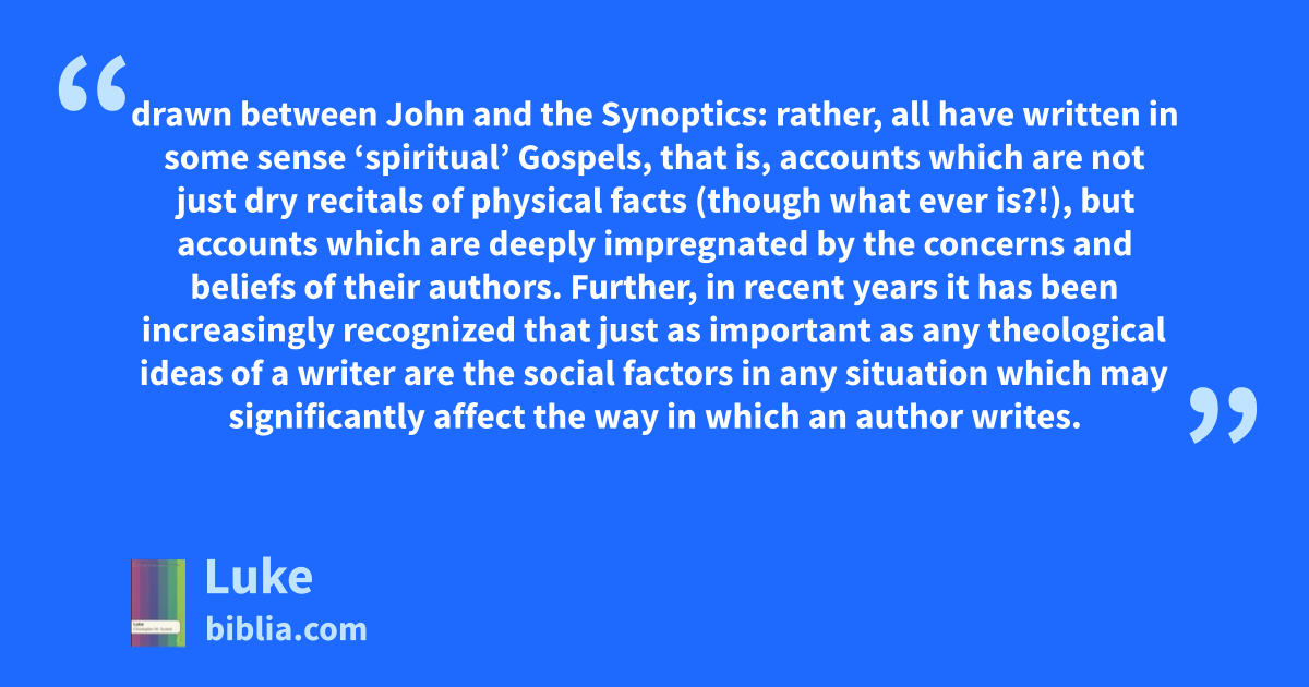 drawn between John and the Synoptics: rather, all have written in some sense ‘spiritual’ Gospels, that is, accounts which are not just dry recitals of physical facts (though what ever is?!), but accounts which are deeply impregnated by the concerns and beliefs of their authors. Further, in recent years it has been increasingly recognized that just as important as any theological ideas of a writer are the social factors in any situation which may significantly affect the way in which an author writes.