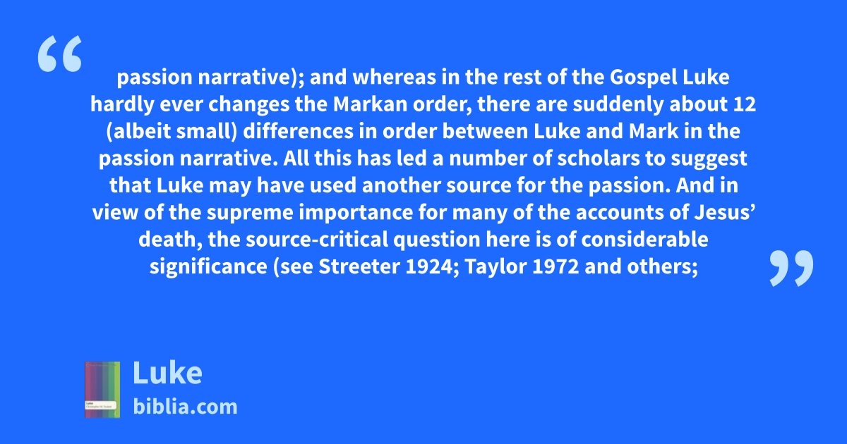 passion narrative); and whereas in the rest of the Gospel Luke hardly ever changes the Markan order, there are suddenly about 12 (albeit small) differences in order between Luke and Mark in the passion narrative. All this has led a number of scholars to suggest that Luke may have used another source for the passion. And in view of the supreme importance for many of the accounts of Jesus’ death, the source-critical question here is of considerable significance (see Streeter 1924; Taylor 1972 and others;
