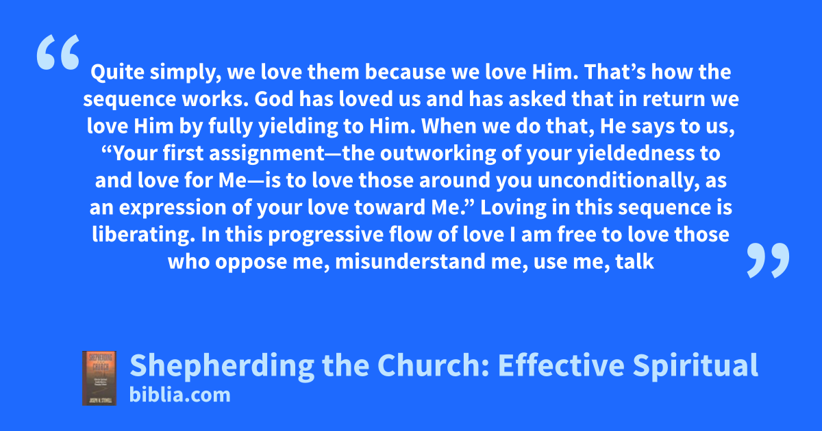 Quite simply, we love them because we love Him. That’s how the sequence works. God has loved us and has asked that in return we love Him by fully yielding to Him. When we do that, He says to us, “Your first assignment—the outworking of your yieldedness to and love for Me—is to love those around you unconditionally, as an expression of your love toward Me.” Loving in this sequence is liberating. In this progressive flow of love I am free to love those who oppose me, misunderstand me, use me, talk