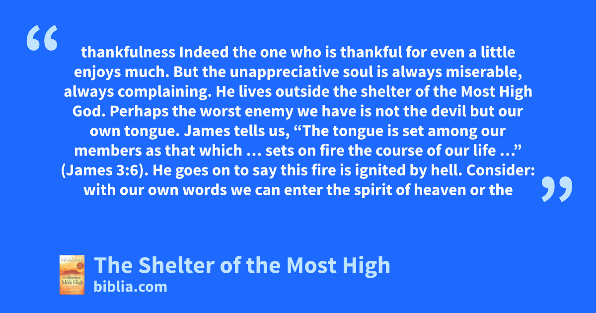 thankfulness Indeed the one who is thankful for even a little enjoys much. But the unappreciative soul is always miserable, always complaining. He lives outside the shelter of the Most High God. Perhaps the worst enemy we have is not the devil but our own tongue. James tells us, “The tongue is set among our members as that which … sets on fire the course of our life …” (James 3:6). He goes on to say this fire is ignited by hell. Consider: with our own words we can enter the spirit of heaven or the