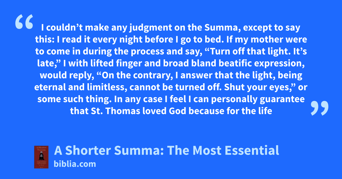 I couldn’t make any judgment on the Summa, except to say this: I read it every night before I go to bed. If my mother were to come in during the process and say, “Turn off that light. It’s late,” I with lifted finger and broad bland beatific expression, would reply, “On the contrary, I answer that the light, being eternal and limitless, cannot be turned off. Shut your eyes,” or some such thing. In any case I feel I can personally guarantee that St. Thomas loved God because for the life