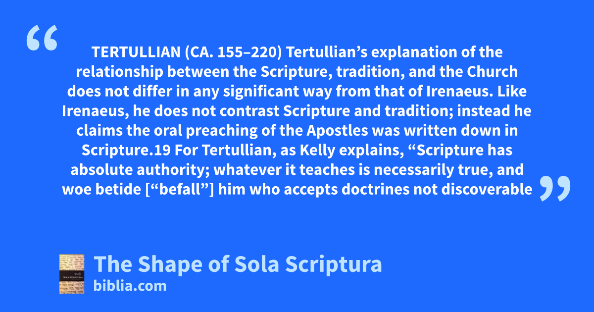 TERTULLIAN (CA. 155–220) Tertullian’s explanation of the relationship between the Scripture, tradition, and the Church does not differ in any significant way from that of Irenaeus. Like Irenaeus, he does not contrast Scripture and tradition; instead he claims the oral preaching of the Apostles was written down in Scripture.19 For Tertullian, as Kelly explains, “Scripture has absolute authority; whatever it teaches is necessarily true, and woe betide [“befall”] him who accepts doctrines not discoverable