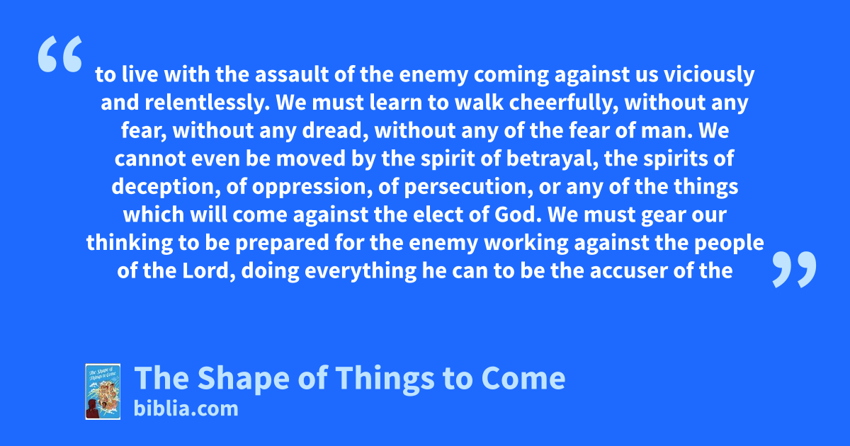 to live with the assault of the enemy coming against us viciously and relentlessly. We must learn to walk cheerfully, without any fear, without any dread, without any of the fear of man. We cannot even be moved by the spirit of betrayal, the spirits of deception, of oppression, of persecution, or any of the things which will come against the elect of God. We must gear our thinking to be prepared for the enemy working against the people of the Lord, doing everything he can to be the accuser of the