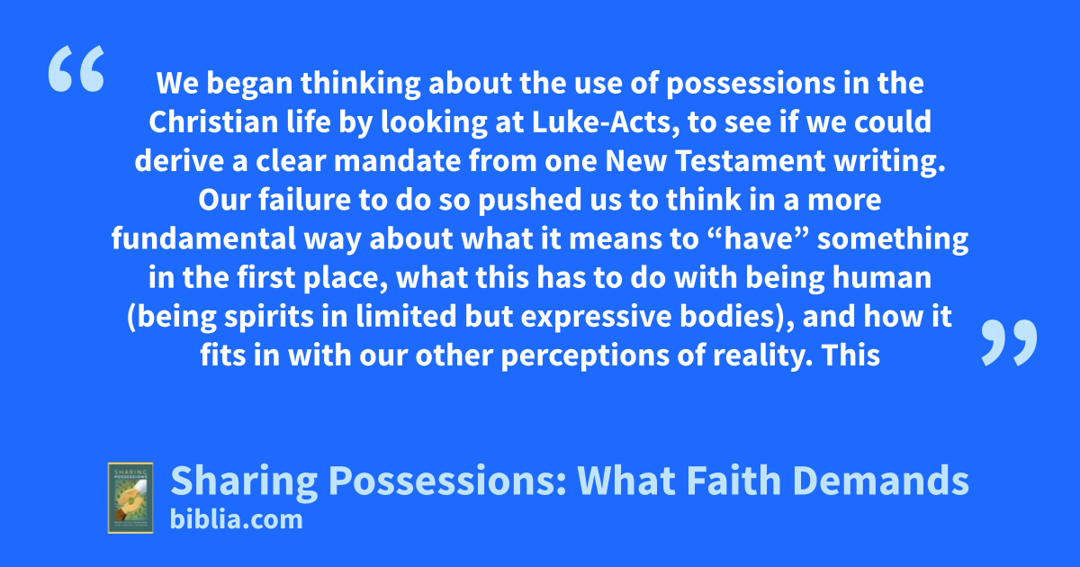 We began thinking about the use of possessions in the Christian life by looking at Luke-Acts, to see if we could derive a clear mandate from one New Testament writing. Our failure to do so pushed us to think in a more fundamental way about what it means to “have” something in the first place, what this has to do with being human (being spirits in limited but expressive bodies), and how it fits in with our other perceptions of reality. This