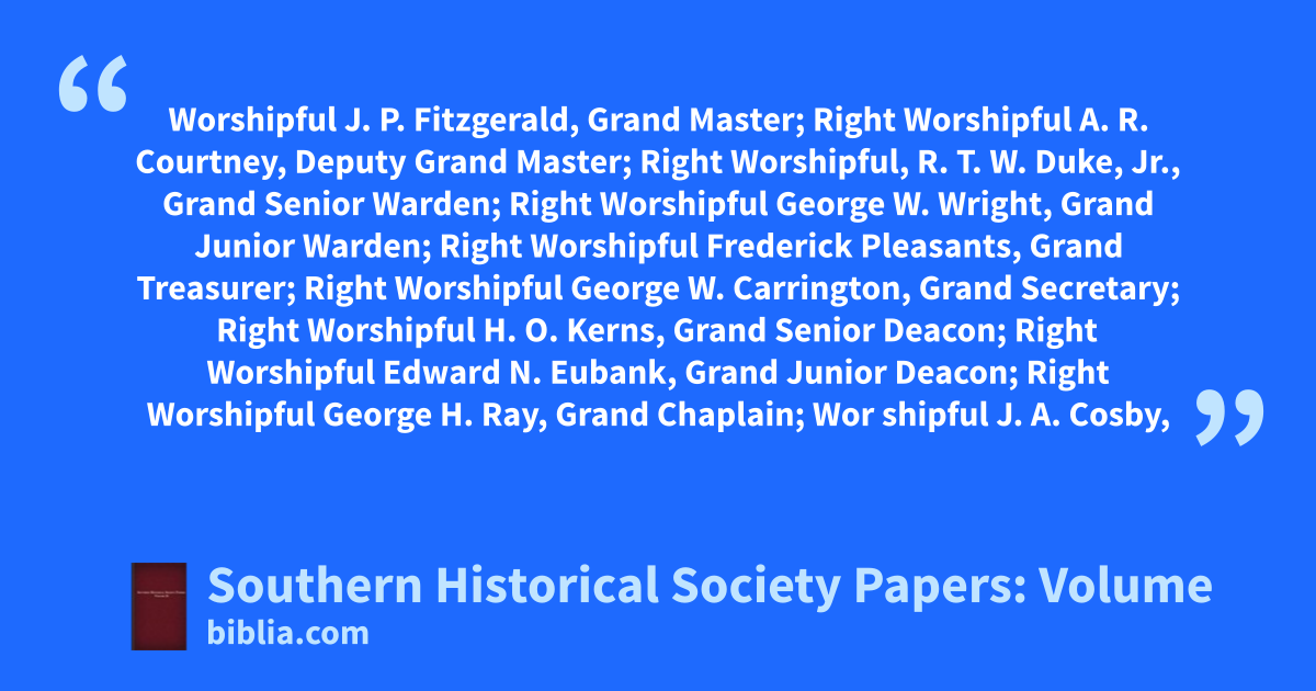 Worshipful J. P. Fitzgerald, Grand Master; Right Worshipful A. R. Courtney, Deputy Grand Master; Right Worshipful, R. T. W. Duke, Jr., Grand Senior Warden; Right Worshipful George W. Wright, Grand Junior Warden; Right Worshipful Frederick Pleasants, Grand Treasurer; Right Worshipful George W. Carrington, Grand Secretary; Right Worshipful H. O. Kerns, Grand Senior Deacon; Right Worshipful Edward N. Eubank, Grand Junior Deacon; Right Worshipful George H. Ray, Grand Chaplain; Wor shipful J. A. Cosby,