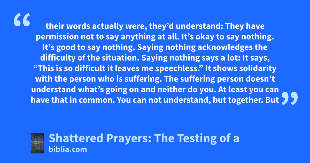 their words actually were, they’d understand: They have permission not to say anything at all. It’s okay to say nothing. It’s good to say nothing. Saying nothing acknowledges the difficulty of the situation. Saying nothing says a lot: It says, “This is so difficult it leaves me speechless.” It shows solidarity with the person who is suffering. The suffering person doesn’t understand what’s going on and neither do you. At least you can have that in common. You can not understand, but together. But