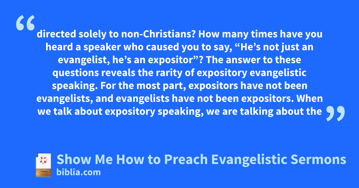 directed solely to non-Christians? How many times have you heard a speaker who caused you to say, “He’s not just an evangelist, he’s an expositor”? The answer to these questions reveals the rarity of expository evangelistic speaking. For the most part, expositors have not been evangelists, and evangelists have not been expositors. When we talk about expository speaking, we are talking about the