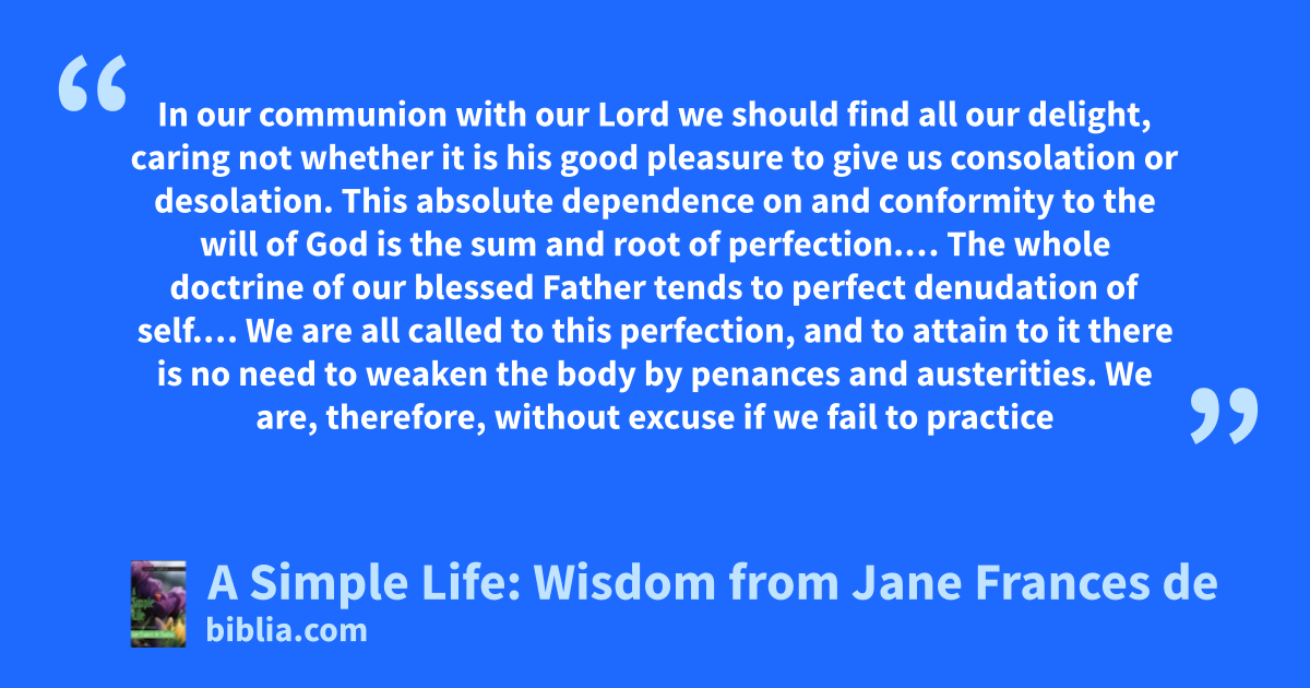 In our communion with our Lord we should find all our delight, caring not whether it is his good pleasure to give us consolation or desolation. This absolute dependence on and conformity to the will of God is the sum and root of perfection.… The whole doctrine of our blessed Father tends to perfect denudation of self.… We are all called to this perfection, and to attain to it there is no need to weaken the body by penances and austerities. We are, therefore, without excuse if we fail to practice
