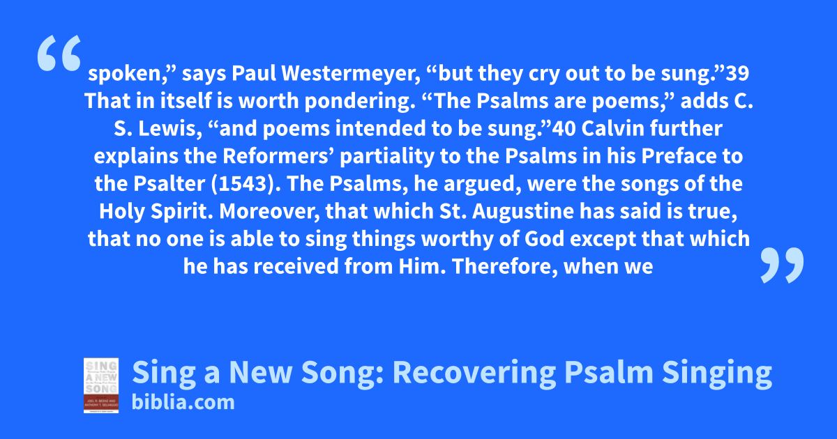 spoken,” says Paul Westermeyer, “but they cry out to be sung.”39 That in itself is worth pondering. “The Psalms are poems,” adds C. S. Lewis, “and poems intended to be sung.”40 Calvin further explains the Reformers’ partiality to the Psalms in his Preface to the Psalter (1543). The Psalms, he argued, were the songs of the Holy Spirit. Moreover, that which St. Augustine has said is true, that no one is able to sing things worthy of God except that which he has received from Him. Therefore, when we