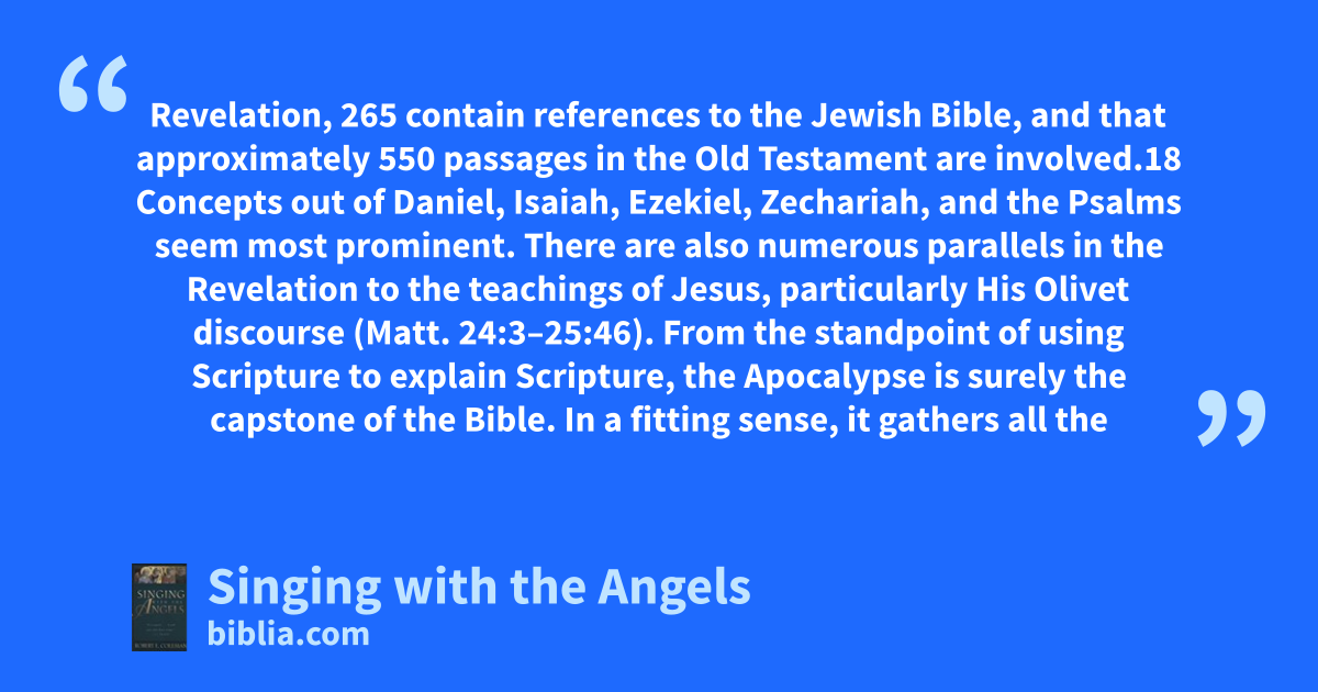 Revelation, 265 contain references to the Jewish Bible, and that approximately 550 passages in the Old Testament are involved.18 Concepts out of Daniel, Isaiah, Ezekiel, Zechariah, and the Psalms seem most prominent. There are also numerous parallels in the Revelation to the teachings of Jesus, particularly His Olivet discourse (Matt. 24:3–25:46). From the standpoint of using Scripture to explain Scripture, the Apocalypse is surely the capstone of the Bible. In a fitting sense, it gathers all the