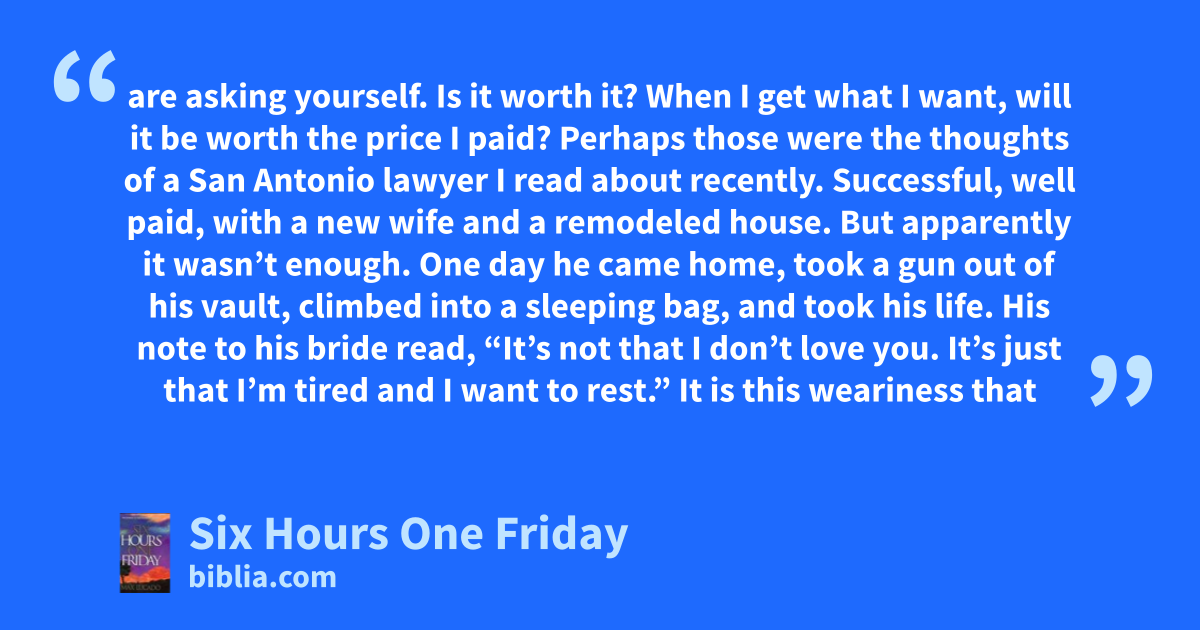 are asking yourself. Is it worth it? When I get what I want, will it be worth the price I paid? Perhaps those were the thoughts of a San Antonio lawyer I read about recently. Successful, well paid, with a new wife and a remodeled house. But apparently it wasn’t enough. One day he came home, took a gun out of his vault, climbed into a sleeping bag, and took his life. His note to his bride read, “It’s not that I don’t love you. It’s just that I’m tired and I want to rest.” It is this weariness that