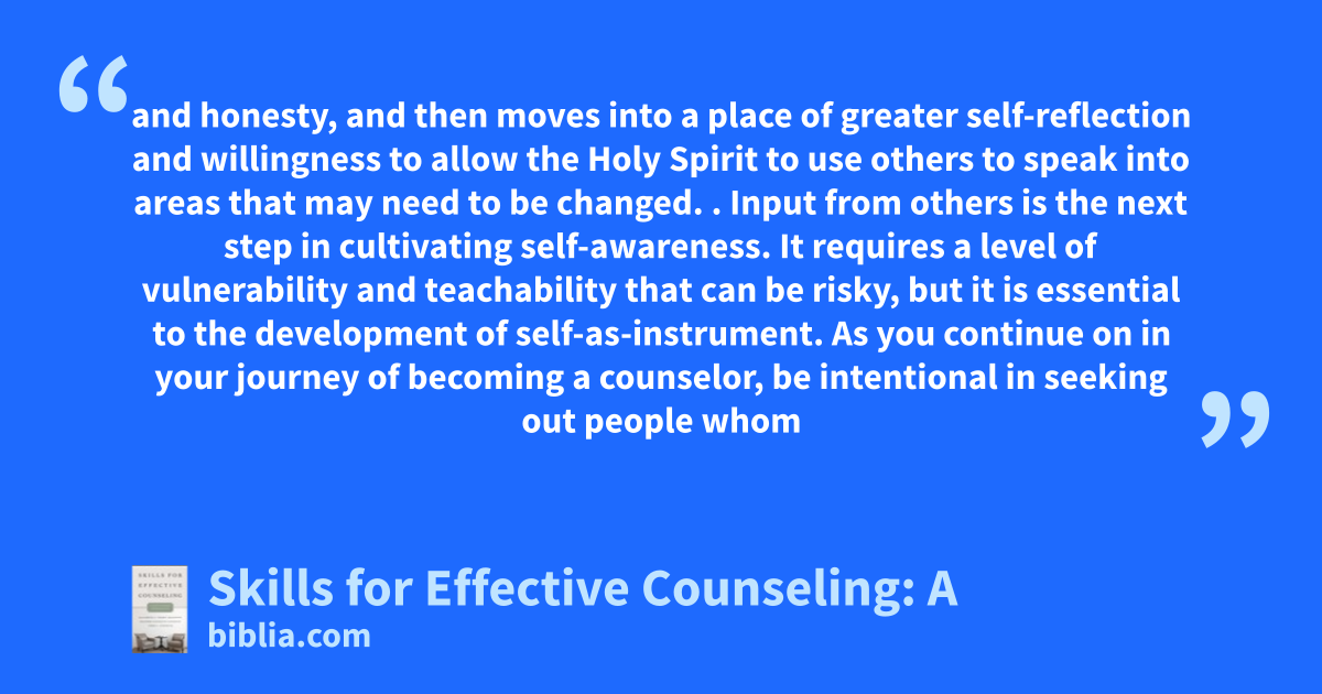 and honesty, and then moves into a place of greater self-reflection and willingness to allow the Holy Spirit to use others to speak into areas that may need to be changed. . Input from others is the next step in cultivating self-awareness. It requires a level of vulnerability and teachability that can be risky, but it is essential to the development of self-as-instrument. As you continue on in your journey of becoming a counselor, be intentional in seeking out people whom