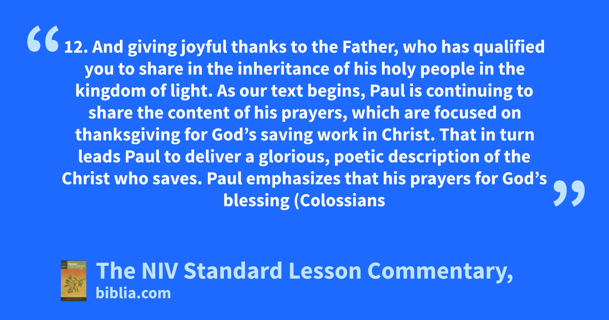 12. And giving joyful thanks to the Father, who has qualified you to share in the inheritance of his holy people in the kingdom of light. As our text begins, Paul is continuing to share the content of his prayers, which are focused on thanksgiving for God’s saving work in Christ. That in turn leads Paul to deliver a glorious, poetic description of the Christ who saves. Paul emphasizes that his prayers for God’s blessing (Colossians