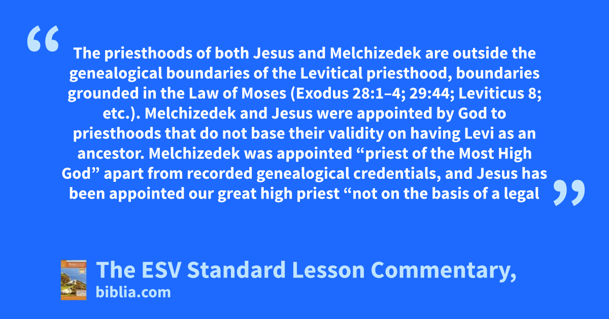 The priesthoods of both Jesus and Melchizedek are outside the genealogical boundaries of the Levitical priesthood, boundaries grounded in the Law of Moses (Exodus 28:1–4; 29:44; Leviticus 8; etc.). Melchizedek and Jesus were appointed by God to priesthoods that do not base their validity on having Levi as an ancestor. Melchizedek was appointed “priest of the Most High God” apart from recorded genealogical credentials, and Jesus has been appointed our great high priest “not on the basis of a legal