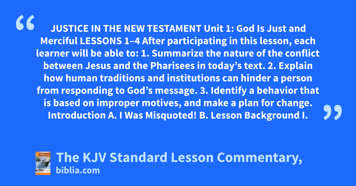 JUSTICE IN THE NEW TESTAMENT Unit 1: God Is Just and Merciful LESSONS 1–4 After participating in this lesson, each learner will be able to: 1. Summarize the nature of the conflict between Jesus and the Pharisees in today’s text. 2. Explain how human traditions and institutions can hinder a person from responding to God’s message. 3. Identify a behavior that is based on improper motives, and make a plan for change. Introduction A. I Was Misquoted! B. Lesson Background I.