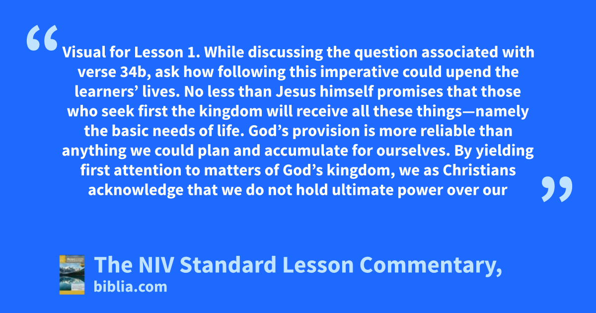 Visual for Lesson 1. While discussing the question associated with verse 34b, ask how following this imperative could upend the learners’ lives. No less than Jesus himself promises that those who seek first the kingdom will receive all these things—namely the basic needs of life. God’s provision is more reliable than anything we could plan and accumulate for ourselves. By yielding first attention to matters of God’s kingdom, we as Christians acknowledge that we do not hold ultimate power over our