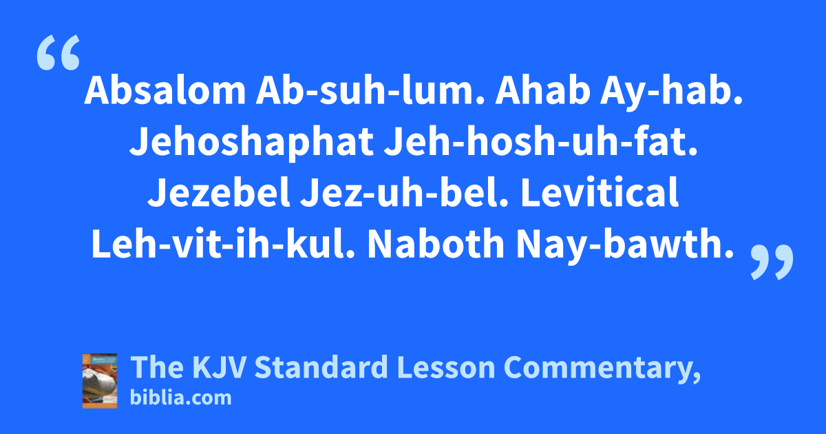 Absalom Ab-suh-lum. Ahab Ay-hab. Jehoshaphat Jeh-hosh-uh-fat. Jezebel Jez-uh-bel. Levitical Leh-vit-ih-kul. Naboth Nay-bawth.