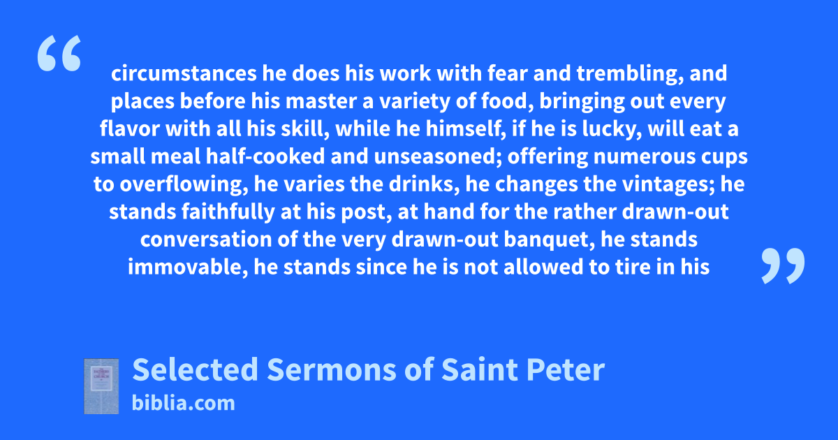circumstances he does his work with fear and trembling, and places before his master a variety of food, bringing out every flavor with all his skill, while he himself, if he is lucky, will eat a small meal half-cooked and unseasoned; offering numerous cups to overflowing, he varies the drinks, he changes the vintages; he stands faithfully at his post, at hand for the rather drawn-out conversation of the very drawn-out banquet, he stands immovable, he stands since he is not allowed to tire in his