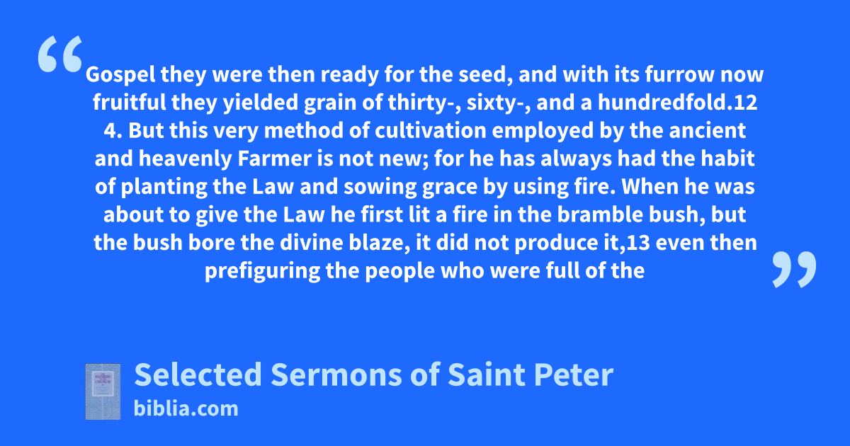 Gospel they were then ready for the seed, and with its furrow now fruitful they yielded grain of thirty-, sixty-, and a hundredfold.12 4. But this very method of cultivation employed by the ancient and heavenly Farmer is not new; for he has always had the habit of planting the Law and sowing grace by using fire. When he was about to give the Law he first lit a fire in the bramble bush, but the bush bore the divine blaze, it did not produce it,13 even then prefiguring the people who were full of the