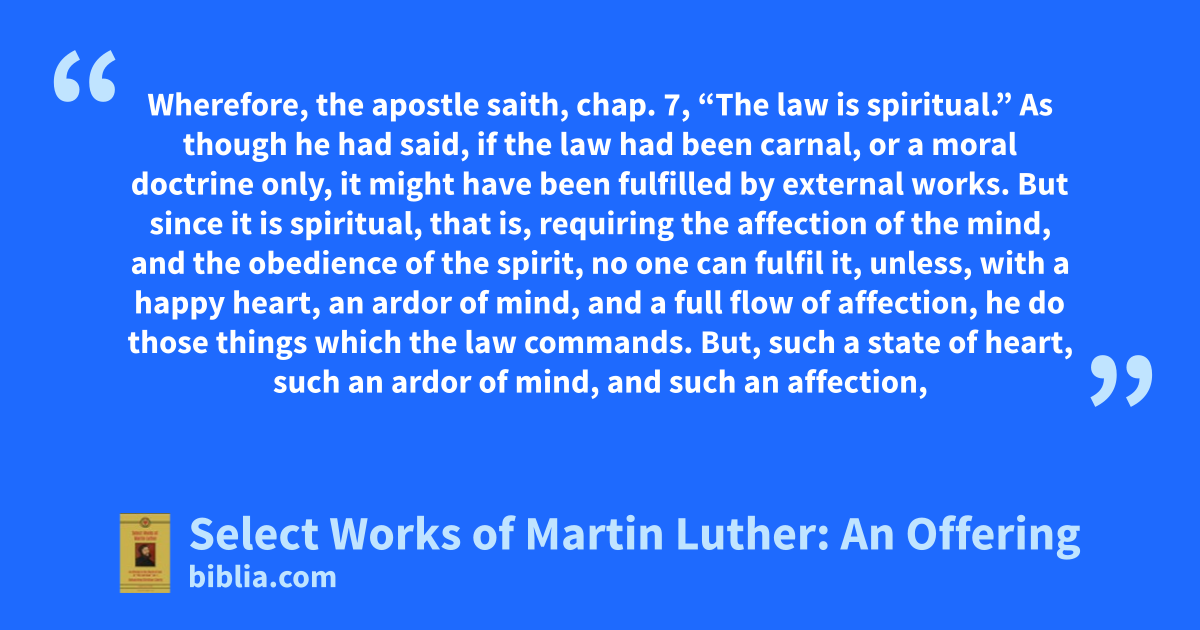 Wherefore, the apostle saith, chap. 7, “The law is spiritual.” As though he had said, if the law had been carnal, or a moral doctrine only, it might have been fulfilled by external works. But since it is spiritual, that is, requiring the affection of the mind, and the obedience of the spirit, no one can fulfil it, unless, with a happy heart, an ardor of mind, and a full flow of affection, he do those things which the law commands. But, such a state of heart, such an ardor of mind, and such an affection,