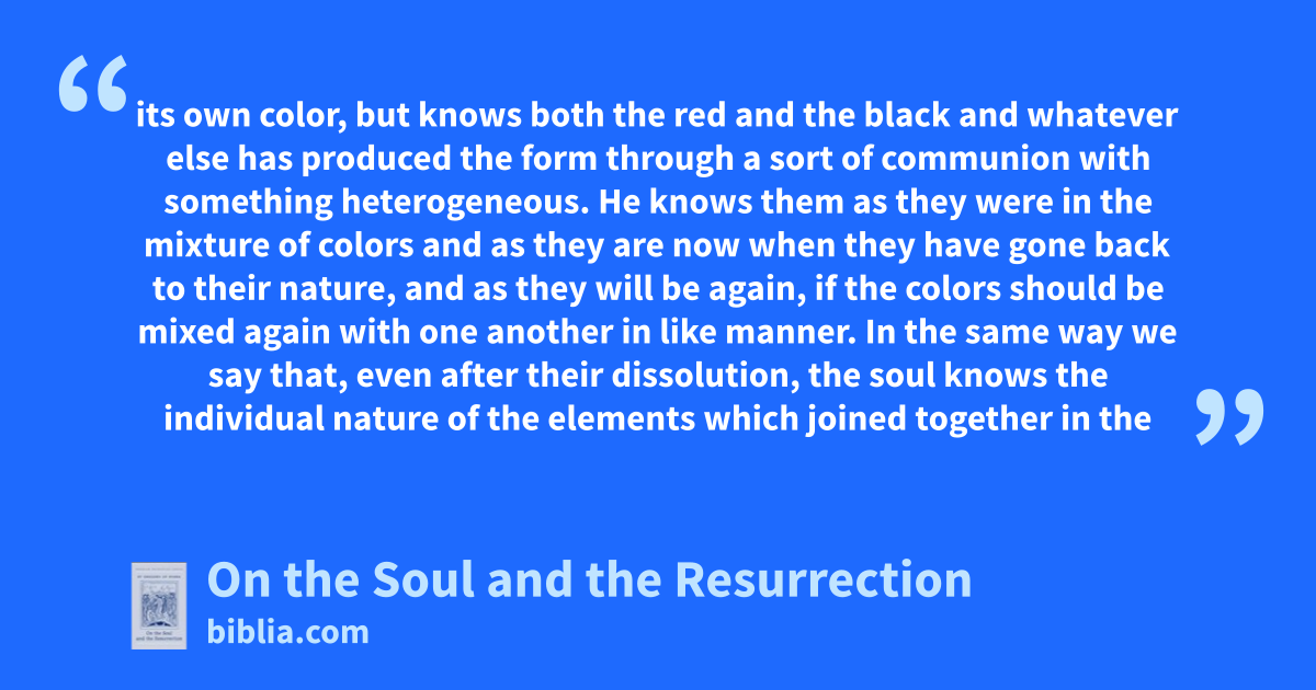 its own color, but knows both the red and the black and whatever else has produced the form through a sort of communion with something heterogeneous. He knows them as they were in the mixture of colors and as they are now when they have gone back to their nature, and as they will be again, if the colors should be mixed again with one another in like manner. In the same way we say that, even after their dissolution, the soul knows the individual nature of the elements which joined together in the