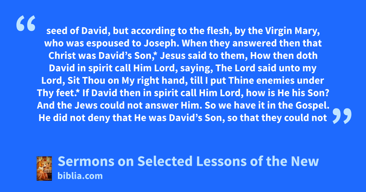 seed of David, but according to the flesh, by the Virgin Mary, who was espoused to Joseph. When they answered then that Christ was David’s Son,* Jesus said to them, How then doth David in spirit call Him Lord, saying, The Lord said unto my Lord, Sit Thou on My right hand, till I put Thine enemies under Thy feet.* If David then in spirit call Him Lord, how is He his Son? And the Jews could not answer Him. So we have it in the Gospel. He did not deny that He was David’s Son, so that they could not