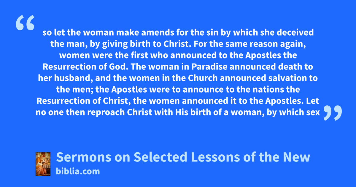 so let the woman make amends for the sin by which she deceived the man, by giving birth to Christ. For the same reason again, women were the first who announced to the Apostles the Resurrection of God. The woman in Paradise announced death to her husband, and the women in the Church announced salvation to the men; the Apostles were to announce to the nations the Resurrection of Christ, the women announced it to the Apostles. Let no one then reproach Christ with His birth of a woman, by which sex