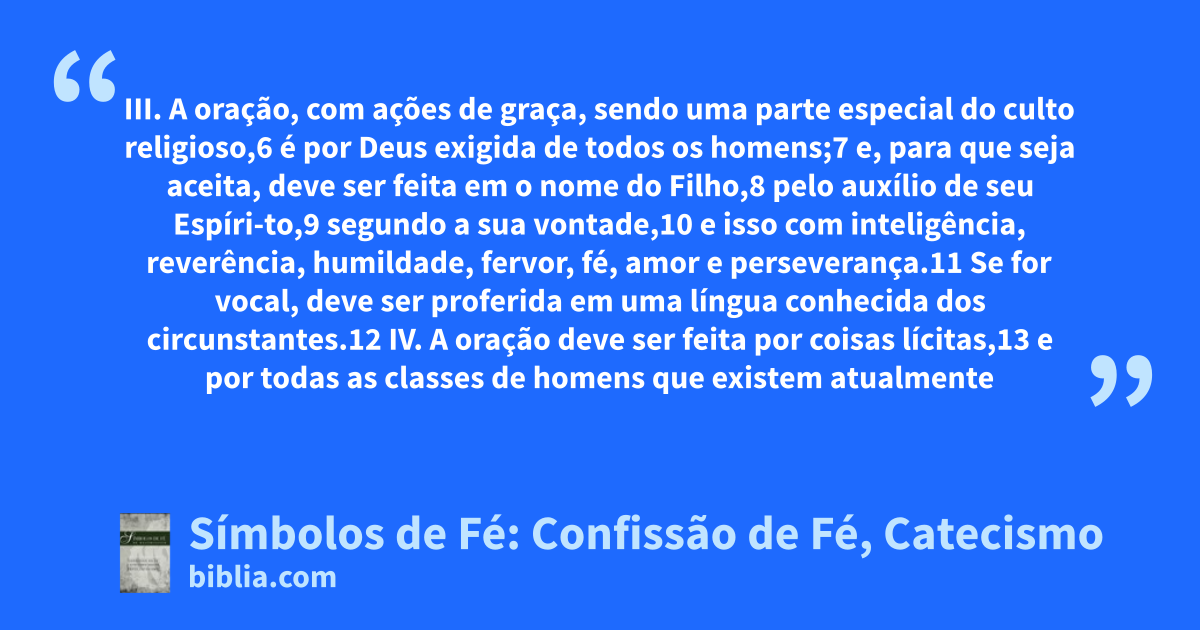 III. A oração, com ações de graça, sendo uma parte especial do culto religioso,6 é por Deus exigida de todos os homens;7 e, para que seja aceita, deve ser feita em o nome do Filho,8 pelo auxílio de seu Espíri-to,9 segundo a sua vontade,10 e isso com inteligência, reverência, humildade, fervor, fé, amor e perseverança.11 Se for vocal, deve ser proferida em uma língua conhecida dos circunstantes.12 IV. A oração deve ser feita por coisas lícitas,13 e por todas as classes de homens que existem atualmente