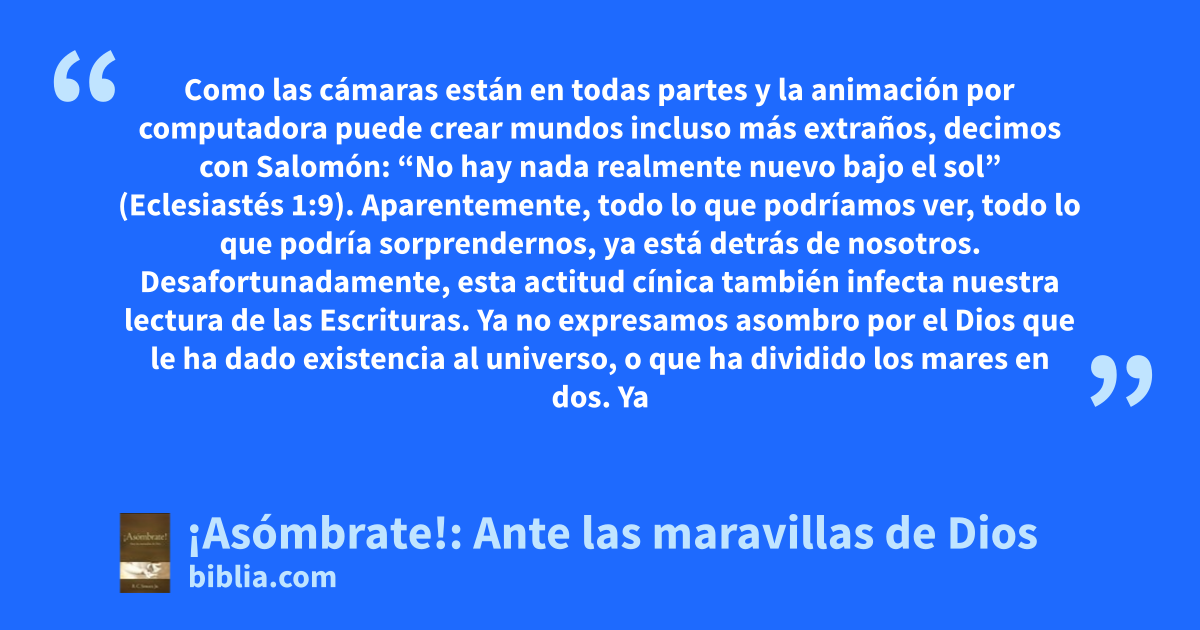 Como las cámaras están en todas partes y la animación por computadora puede crear mundos incluso más extraños, decimos con Salomón: “No hay nada realmente nuevo bajo el sol” (Eclesiastés 1:9). Aparentemente, todo lo que podríamos ver, todo lo que podría sorprendernos, ya está detrás de nosotros. Desafortunadamente, esta actitud cínica también infecta nuestra lectura de las Escrituras. Ya no expresamos asombro por el Dios que le ha dado existencia al universo, o que ha dividido los mares en dos. Ya