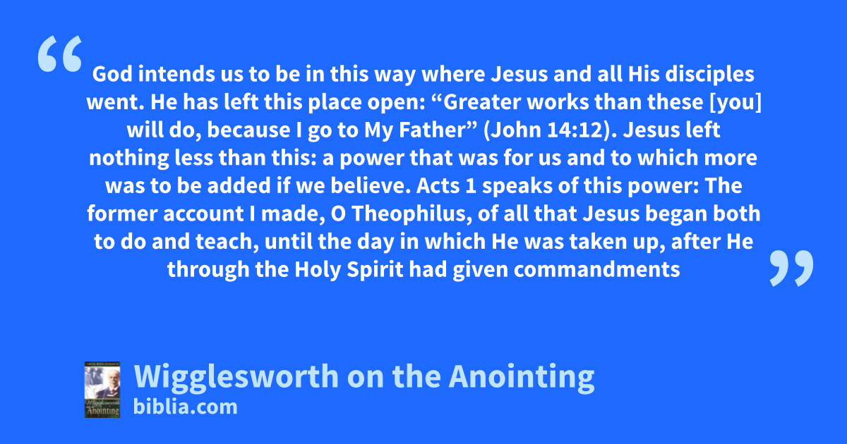 God intends us to be in this way where Jesus and all His disciples went. He has left this place open: “Greater works than these [you] will do, because I go to My Father” (John 14:12). Jesus left nothing less than this: a power that was for us and to which more was to be added if we believe. Acts 1 speaks of this power: The former account I made, O Theophilus, of all that Jesus began both to do and teach, until the day in which He was taken up, after He through the Holy Spirit had given commandments