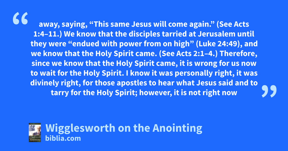 away, saying, “This same Jesus will come again.” (See Acts 1:4–11.) We know that the disciples tarried at Jerusalem until they were “endued with power from on high” (Luke 24:49), and we know that the Holy Spirit came. (See Acts 2:1–4.) Therefore, since we know that the Holy Spirit came, it is wrong for us now to wait for the Holy Spirit. I know it was personally right, it was divinely right, for those apostles to hear what Jesus said and to tarry for the Holy Spirit; however, it is not right now