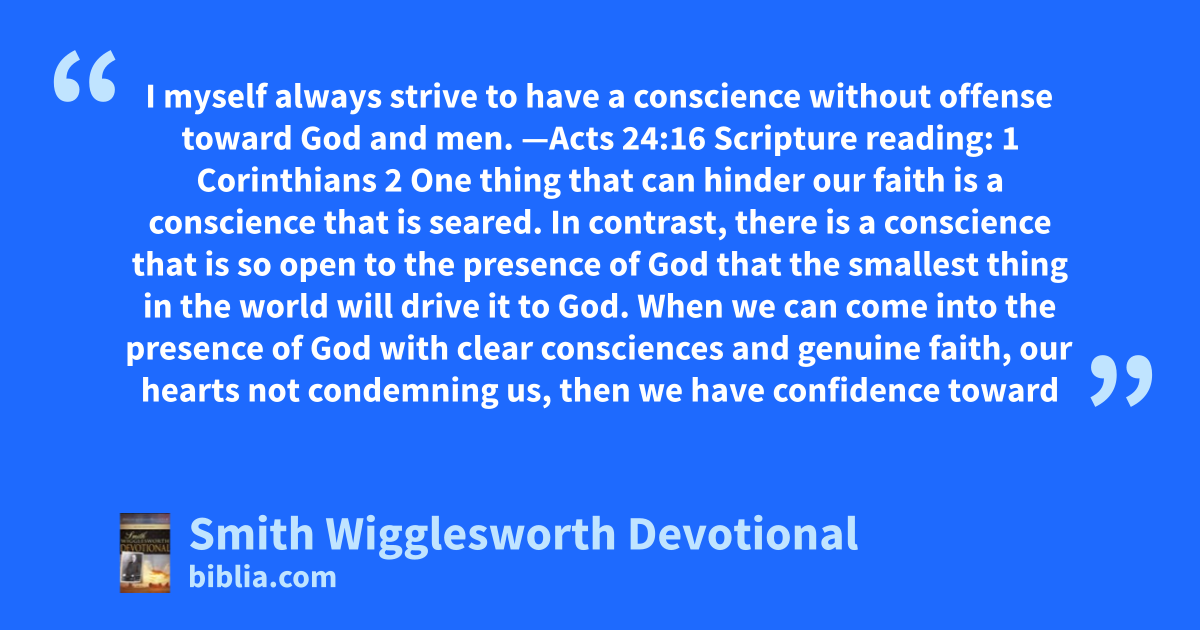 I myself always strive to have a conscience without offense toward God and men. —Acts 24:16 Scripture reading: 1 Corinthians 2 One thing that can hinder our faith is a conscience that is seared. In contrast, there is a conscience that is so open to the presence of God that the smallest thing in the world will drive it to God. When we can come into the presence of God with clear consciences and genuine faith, our hearts not condemning us, then we have confidence toward