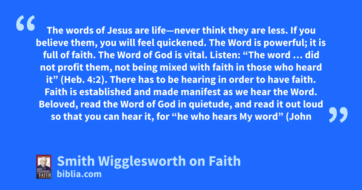The words of Jesus are life—never think they are less. If you believe them, you will feel quickened. The Word is powerful; it is full of faith. The Word of God is vital. Listen: “The word … did not profit them, not being mixed with faith in those who heard it” (Heb. 4:2). There has to be hearing in order to have faith. Faith is established and made manifest as we hear the Word. Beloved, read the Word of God in quietude, and read it out loud so that you can hear it, for “he who hears My word” (John