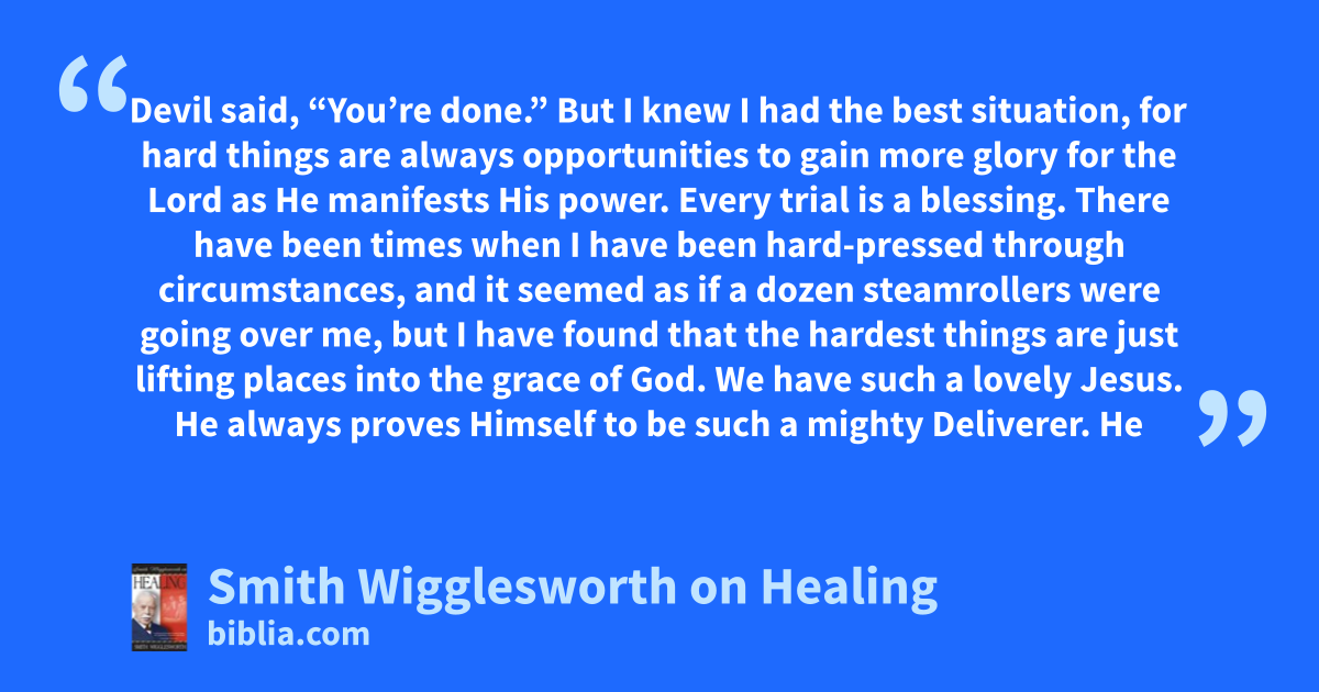 Devil said, “You’re done.” But I knew I had the best situation, for hard things are always opportunities to gain more glory for the Lord as He manifests His power. Every trial is a blessing. There have been times when I have been hard-pressed through circumstances, and it seemed as if a dozen steamrollers were going over me, but I have found that the hardest things are just lifting places into the grace of God. We have such a lovely Jesus. He always proves Himself to be such a mighty Deliverer. He