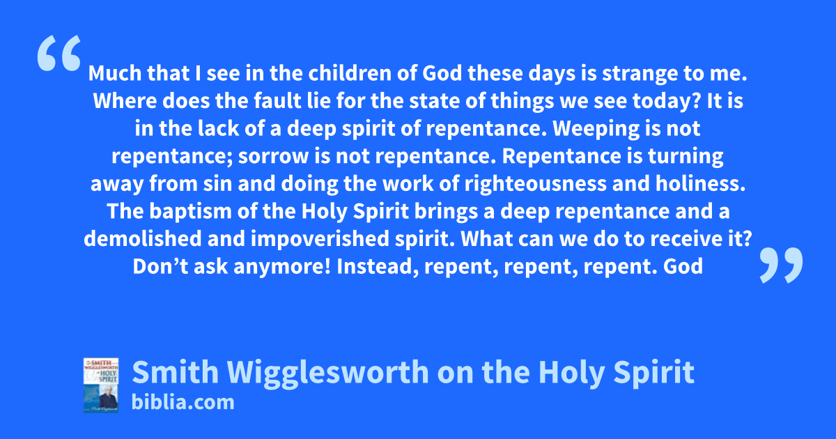 Much that I see in the children of God these days is strange to me. Where does the fault lie for the state of things we see today? It is in the lack of a deep spirit of repentance. Weeping is not repentance; sorrow is not repentance. Repentance is turning away from sin and doing the work of righteousness and holiness. The baptism of the Holy Spirit brings a deep repentance and a demolished and impoverished spirit. What can we do to receive it? Don’t ask anymore! Instead, repent, repent, repent. God