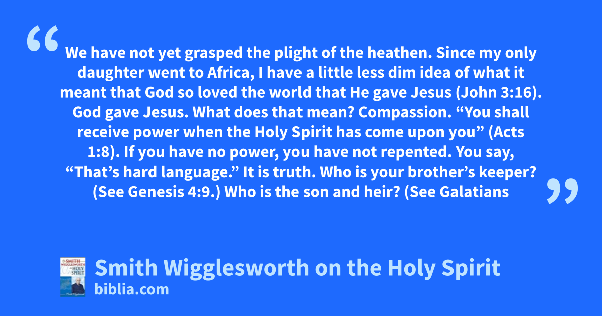 We have not yet grasped the plight of the heathen. Since my only daughter went to Africa, I have a little less dim idea of what it meant that God so loved the world that He gave Jesus (John 3:16). God gave Jesus. What does that mean? Compassion. “You shall receive power when the Holy Spirit has come upon you” (Acts 1:8). If you have no power, you have not repented. You say, “That’s hard language.” It is truth. Who is your brother’s keeper? (See Genesis 4:9.) Who is the son and heir? (See Galatians