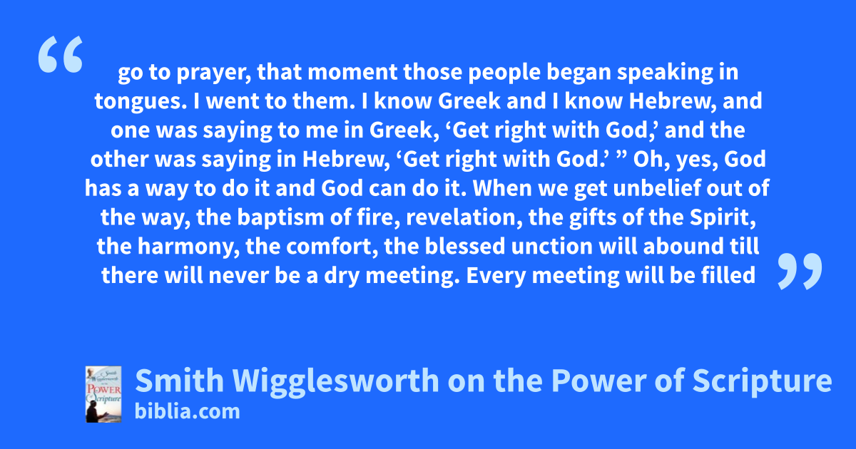 go to prayer, that moment those people began speaking in tongues. I went to them. I know Greek and I know Hebrew, and one was saying to me in Greek, ‘Get right with God,’ and the other was saying in Hebrew, ‘Get right with God.’ ” Oh, yes, God has a way to do it and God can do it. When we get unbelief out of the way, the baptism of fire, revelation, the gifts of the Spirit, the harmony, the comfort, the blessed unction will abound till there will never be a dry meeting. Every meeting will be filled