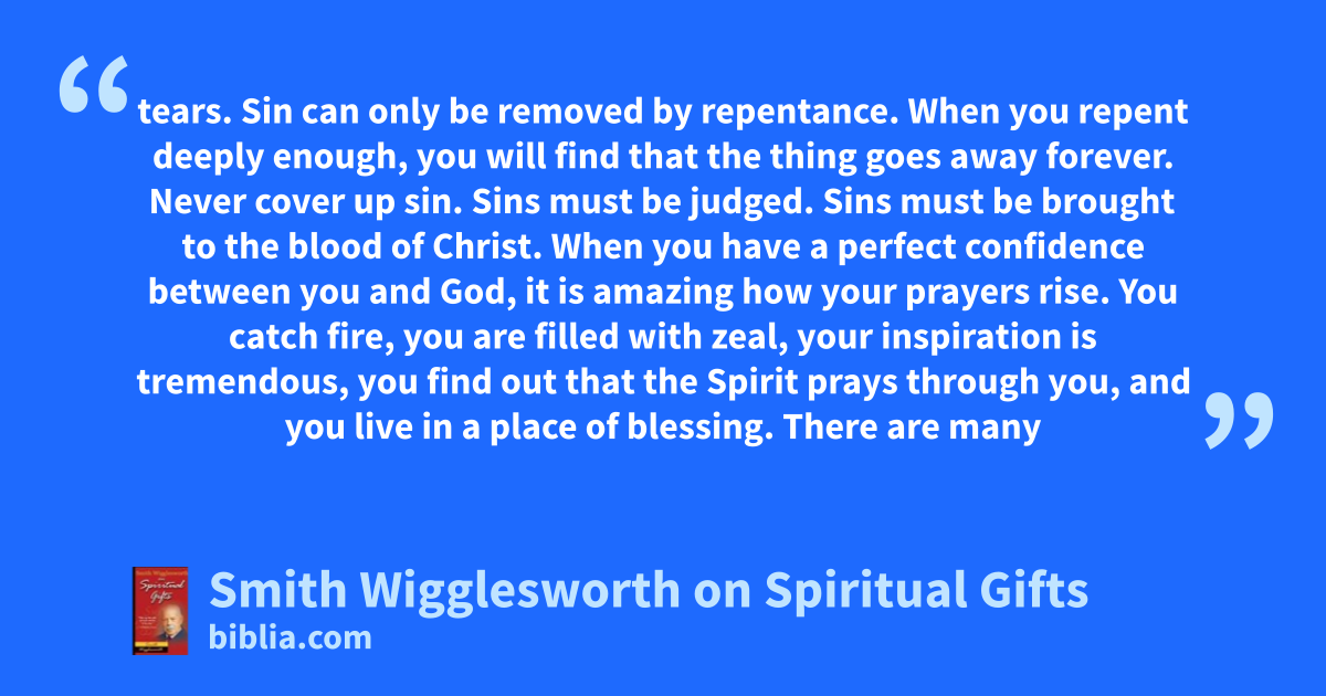 tears. Sin can only be removed by repentance. When you repent deeply enough, you will find that the thing goes away forever. Never cover up sin. Sins must be judged. Sins must be brought to the blood of Christ. When you have a perfect confidence between you and God, it is amazing how your prayers rise. You catch fire, you are filled with zeal, your inspiration is tremendous, you find out that the Spirit prays through you, and you live in a place of blessing. There are many
