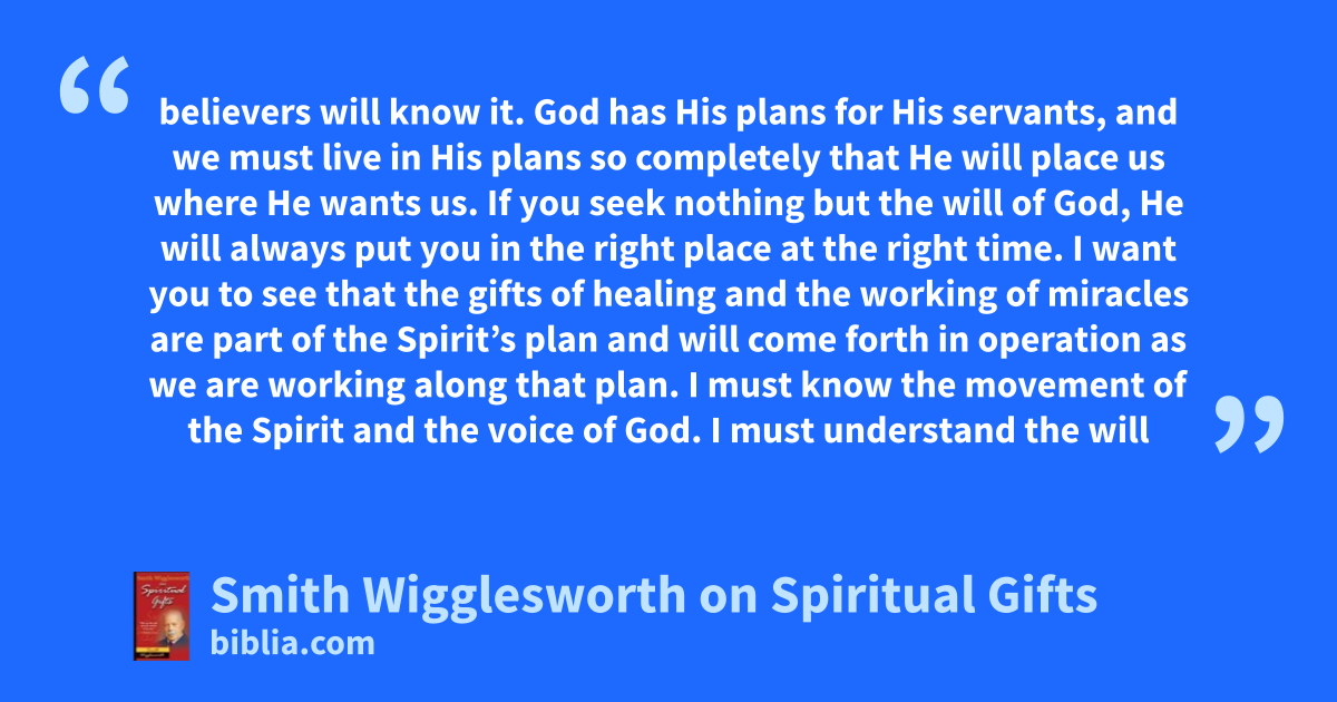 believers will know it. God has His plans for His servants, and we must live in His plans so completely that He will place us where He wants us. If you seek nothing but the will of God, He will always put you in the right place at the right time. I want you to see that the gifts of healing and the working of miracles are part of the Spirit’s plan and will come forth in operation as we are working along that plan. I must know the movement of the Spirit and the voice of God. I must understand the will