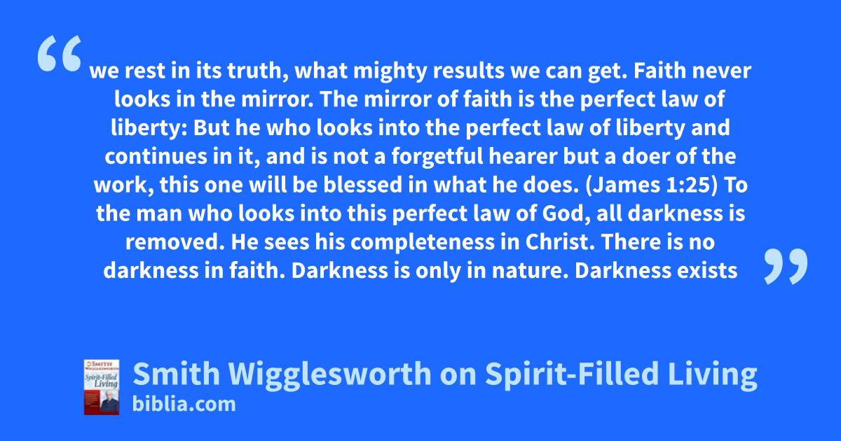 we rest in its truth, what mighty results we can get. Faith never looks in the mirror. The mirror of faith is the perfect law of liberty: But he who looks into the perfect law of liberty and continues in it, and is not a forgetful hearer but a doer of the work, this one will be blessed in what he does. (James 1:25) To the man who looks into this perfect law of God, all darkness is removed. He sees his completeness in Christ. There is no darkness in faith. Darkness is only in nature. Darkness exists