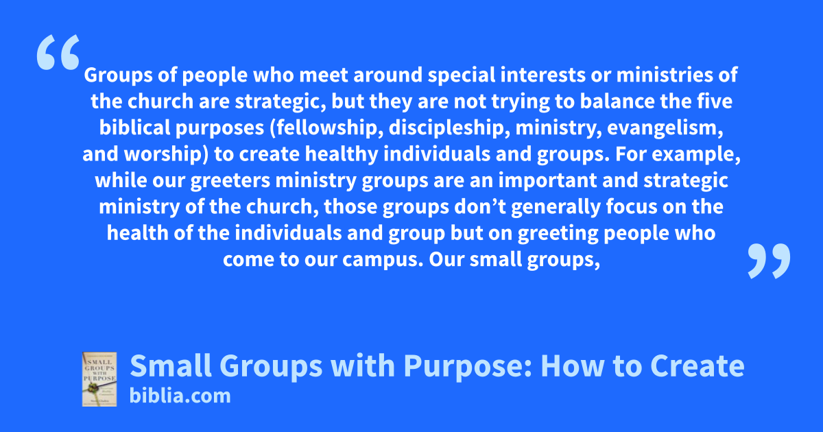 Groups of people who meet around special interests or ministries of the church are strategic, but they are not trying to balance the five biblical purposes (fellowship, discipleship, ministry, evangelism, and worship) to create healthy individuals and groups. For example, while our greeters ministry groups are an important and strategic ministry of the church, those groups don’t generally focus on the health of the individuals and group but on greeting people who come to our campus. Our small groups,