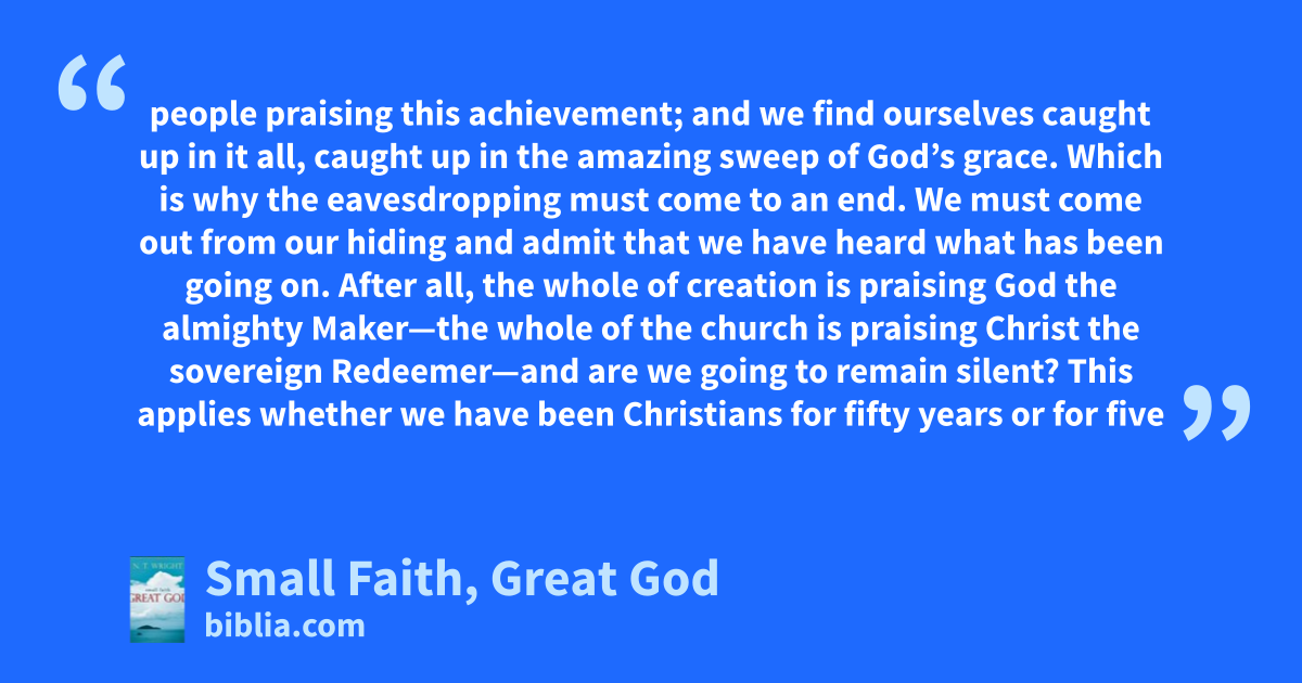 people praising this achievement; and we find ourselves caught up in it all, caught up in the amazing sweep of God’s grace. Which is why the eavesdropping must come to an end. We must come out from our hiding and admit that we have heard what has been going on. After all, the whole of creation is praising God the almighty Maker—the whole of the church is praising Christ the sovereign Redeemer—and are we going to remain silent? This applies whether we have been Christians for fifty years or for five